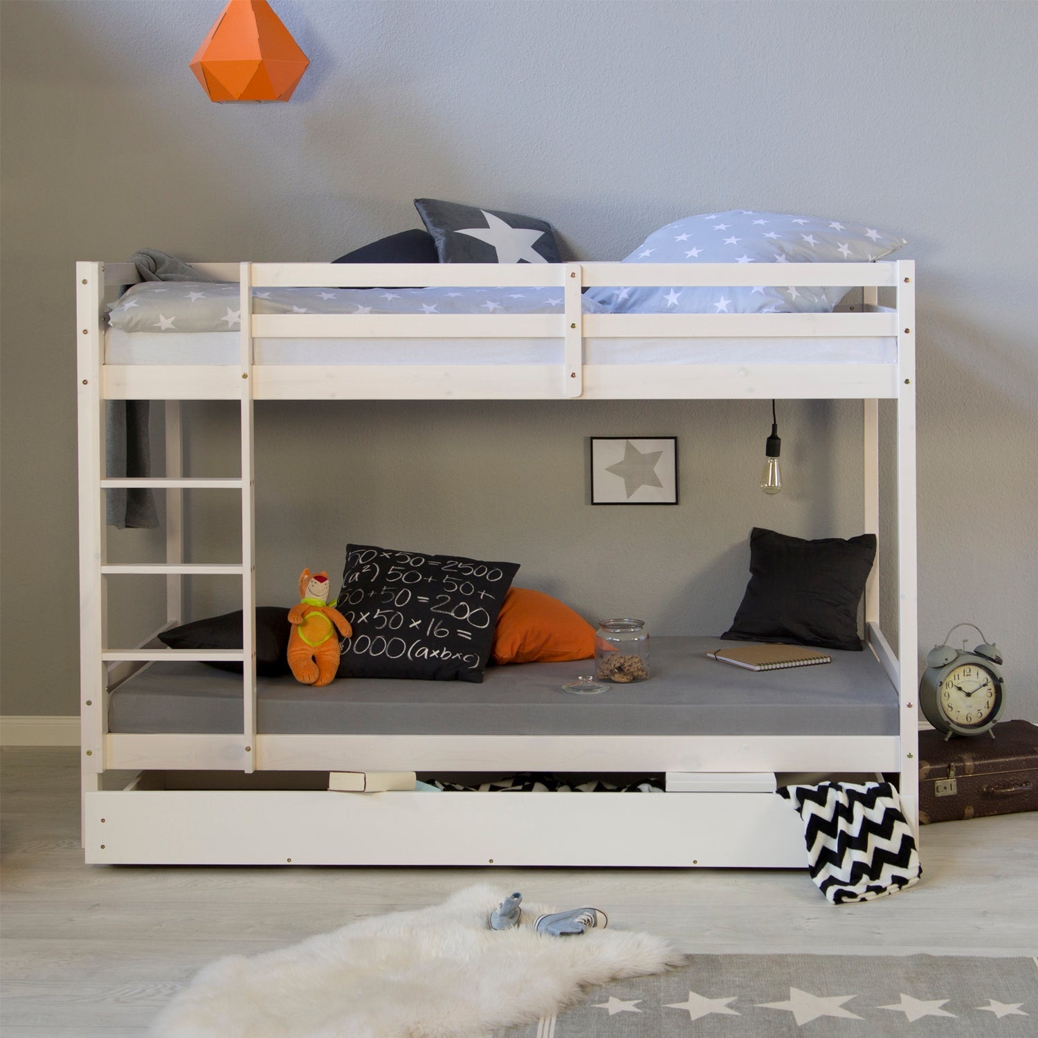 Im Lieferumfang sind zwei Lattenroste sowie zwei hochwertige Matratzen enthalten, die für optimalen Schlafkomfort sorgen. Dieses Etagenbett vereint robustes Design mit praktischen Stauraummöglichkeiten und fügt sich harmonisch in verschiedene Einrichtungsstile ein. Es ist die ideale Wahl für Familien, die Funktionalität und Komfort kombinieren möchten.