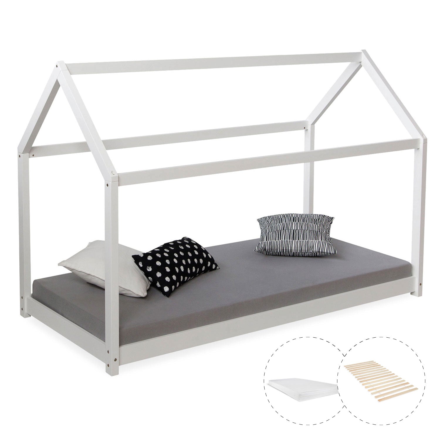 A simple children's bed with a big impact. Made from solid wooden slats and posts in the shape of a house, this bed transforms into a play den, a cozy haven, and a place to sleep. Thanks to its stable and safe construction, the raised sleeping surface, and the easy-care, high-quality wood finish, this house bed is especially child-friendly. The children's house bed comes with detailed assembly instructions and is easy to put together. A suitable mattress is included.