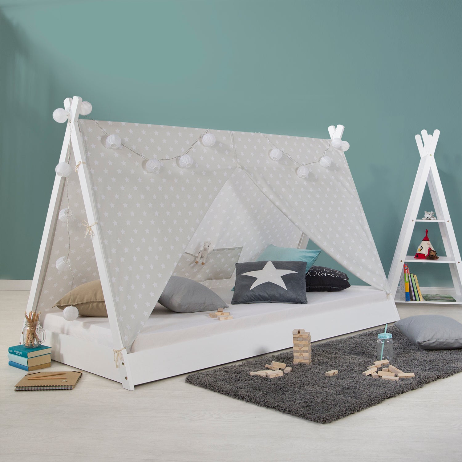- Teepee bed with floor-level lying surface in a simple white and grey design