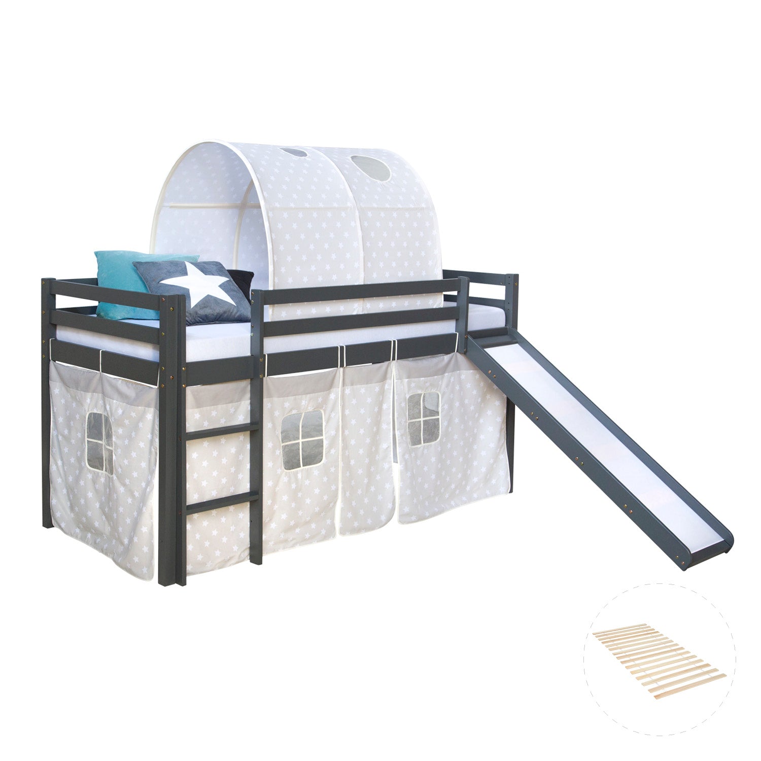 - Rutschbett mit Lattenrost, Tunnel & Vorhang (Sternenmotiv), Aufbauanleitung, Montagezubehör