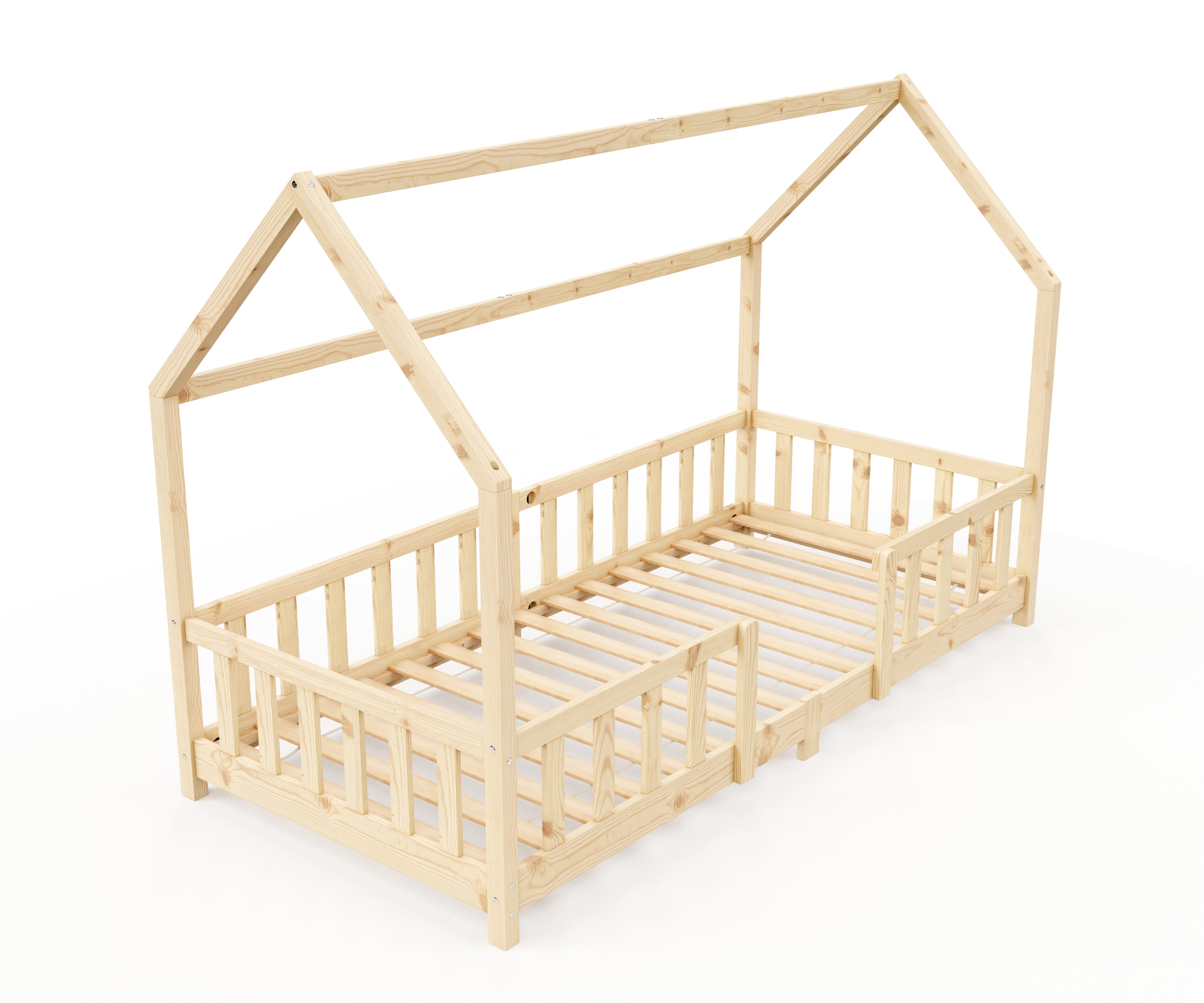 This MAISON children's bed is the perfect solution for any child's room! Made from natural pine wood, it ensures restful dreams. The wide sleeping area provides ample space for your little one to relax, play, and embark on adventures with their plush toys. The sturdy wooden frame is designed like a house and can easily be transformed into a four-poster bed with curtains. The low bed frame and side slats prevent your child from falling out. Fulfill all your child's dreams with this MAISON children's bed!