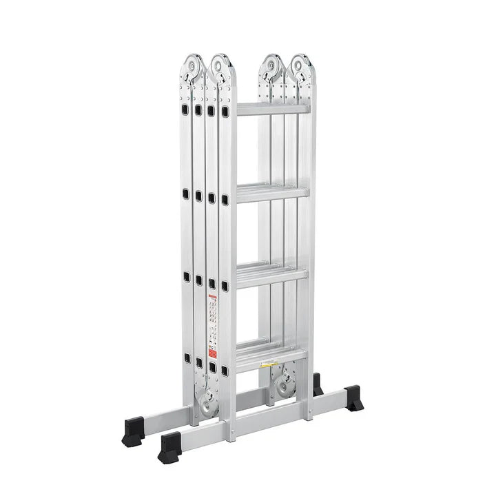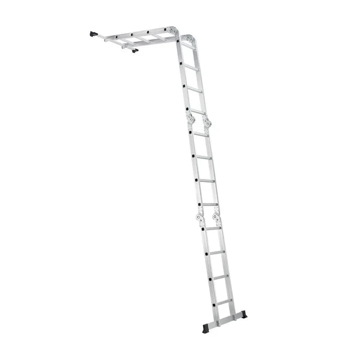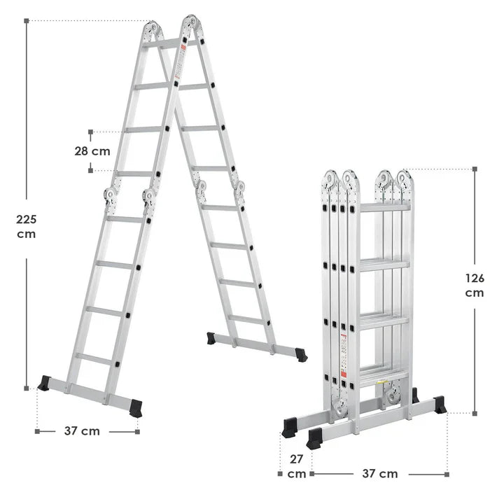 Unsere Vielzweckleiter ist ein echtes Multitalent. Das ausgeklügelte Gelenksystem mit 6 Gelenken teilt die Mehrzweckleiter in 4 Elemente mit jeweils 4 Sprossen. So können Sie die Leiter je nach Bedarf als Anlegeleiter oder Bockleiter verwenden. Voll ausgeklappt erreicht die Leiter eine Höhe von 4,7 Meter.