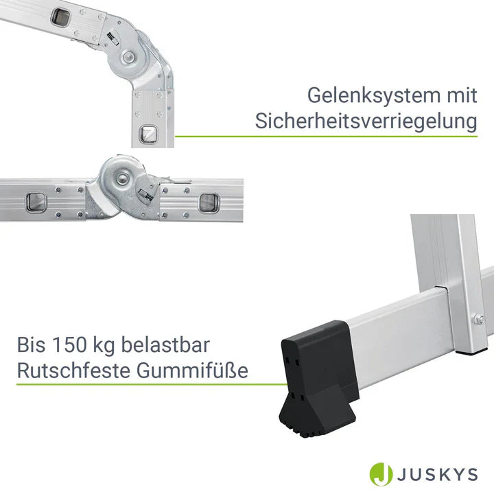 Die Gelenkleiter trägt bis zu 150 kg Gewicht. Breite Treppenstufen mit Anti-Rutschprofil verhindern das Abrutschen und sorgen für einen sicheren Halt. Das Gelenksystem mit Sicherheitsverriegelung verleiht der Multifunktionsleiter Stabilität.