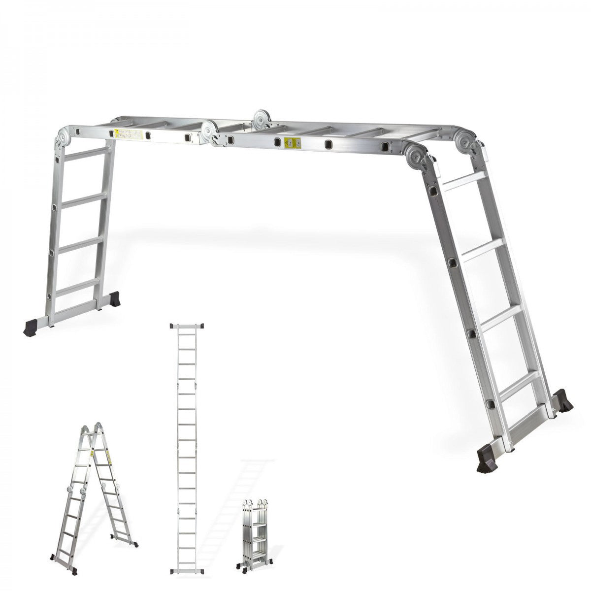 Einsetzbar als Anlegeleiter, Doppelstehleiter und Arbeitsbühne.
