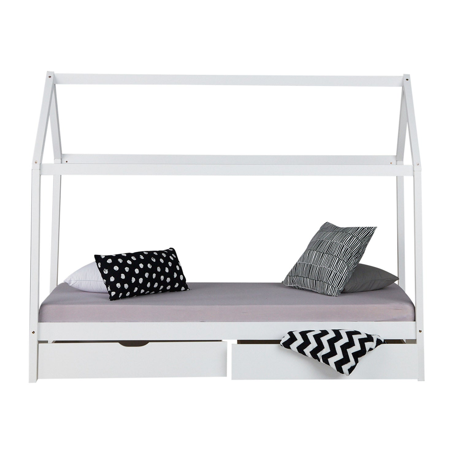 Das Hausbett wird mit detaillierter Aufbauanleitung geliefert und ist leicht und schnell zu montieren. Eine passende Matratze ist bereits im Lieferumfang enthalten.