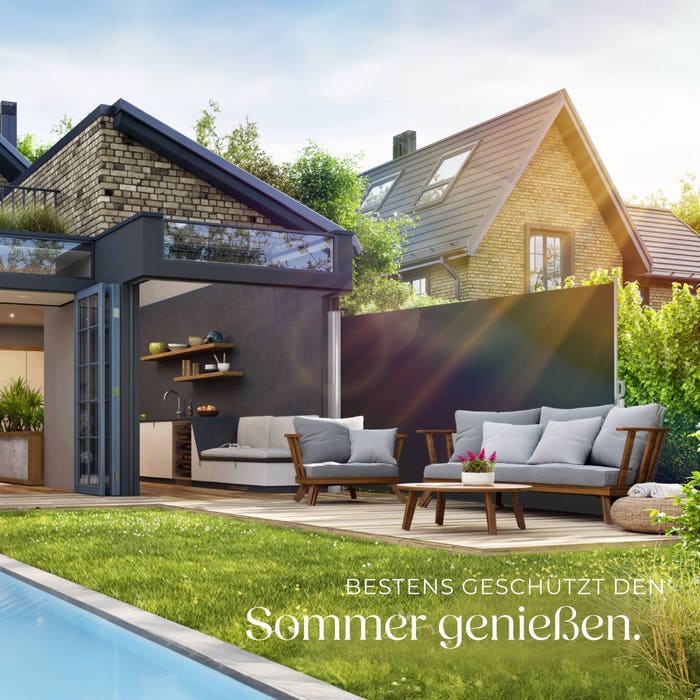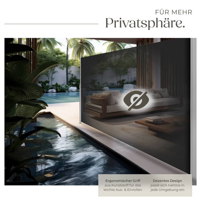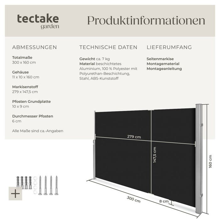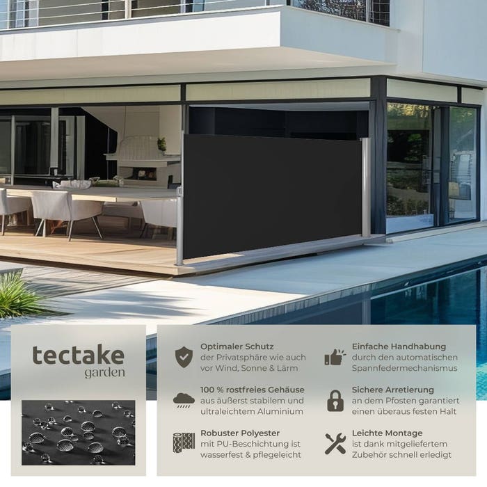 Diese schöne Seitenmarkise ist der perfekte Schutz ihrer Privatsphäre und zudem vor Wind. Sie und Ihre Gäste sind dadurch ungestört im Garten, auf der Terrasse oder dem Balkon. Durch den automatischen Aufrollmechanismus sind die Seitenmarkisen in wenigen Augenblicken aufgespannt. Die Markisen von tectake bieten mehr als nur Sonnenschutz und Windschutz. Der robuste, wetterfeste Polyesterstoff ist sehr langlebig und verfügt zudem über einen integrierten UV-Schutz. Die Seitenmarkise lässt sich auf bis zu 3 m aufspannen. Nach Gebrauch rollt sich das Markisentuch durch den eingebauten Spannfedermechanismus wieder in das Aluminiumgehäuse zurück. Die Montage erfolgt in nur wenigen Schritten. Es sind nur jeweils vier Löcher in Boden und Wand nötig um diese Seitenmarkise zu befestigen. Schrauben, Dübel und Klammern sind im Lieferumfang bereits enthalten.