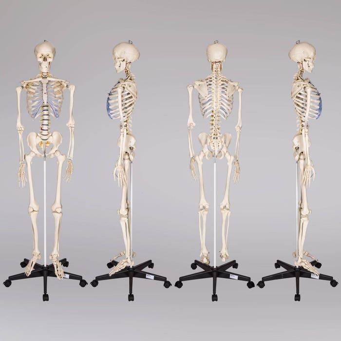 Das leichte Skelett ist an einem stabilen Ständer angebracht, der mit einem Ring zum Aufhängen versehen ist. Ein funktionales Fusskreuz mit 5 leichtgängigen Rollen ermöglicht einen schnellen und bequemen Transport des Anatomieskeletts. Diese Bauweise macht das Modell besonders zweckmässig und flexibel in der Anwendung.