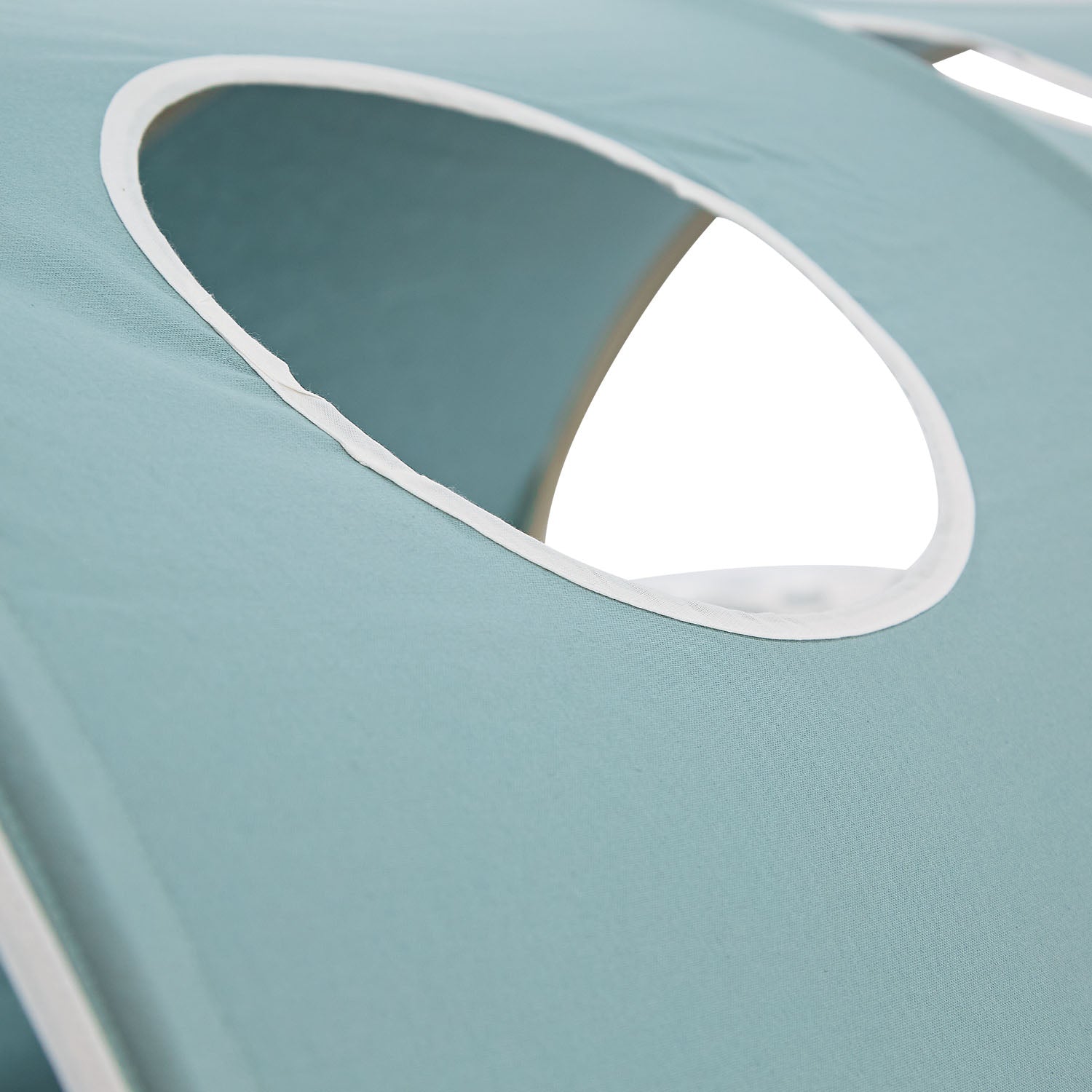 Besonders hervorzuheben ist das textile Design: Der mintfarbene Stoffvorhang unterhalb der Liegefläche sorgt für eine angenehme Leichtigkeit und bietet eine vielseitig nutzbare Fläche – ob als Stauraum oder gemütliche Rückzugsecke. Die rundlichen Fensterdetails verleihen dem Bett eine luftige Optik. Ergänzt wird das Design durch das halbrunde Stoffdach in sanftem Blaugrün, das eine geschützte, behagliche Schlafumgebung schafft.