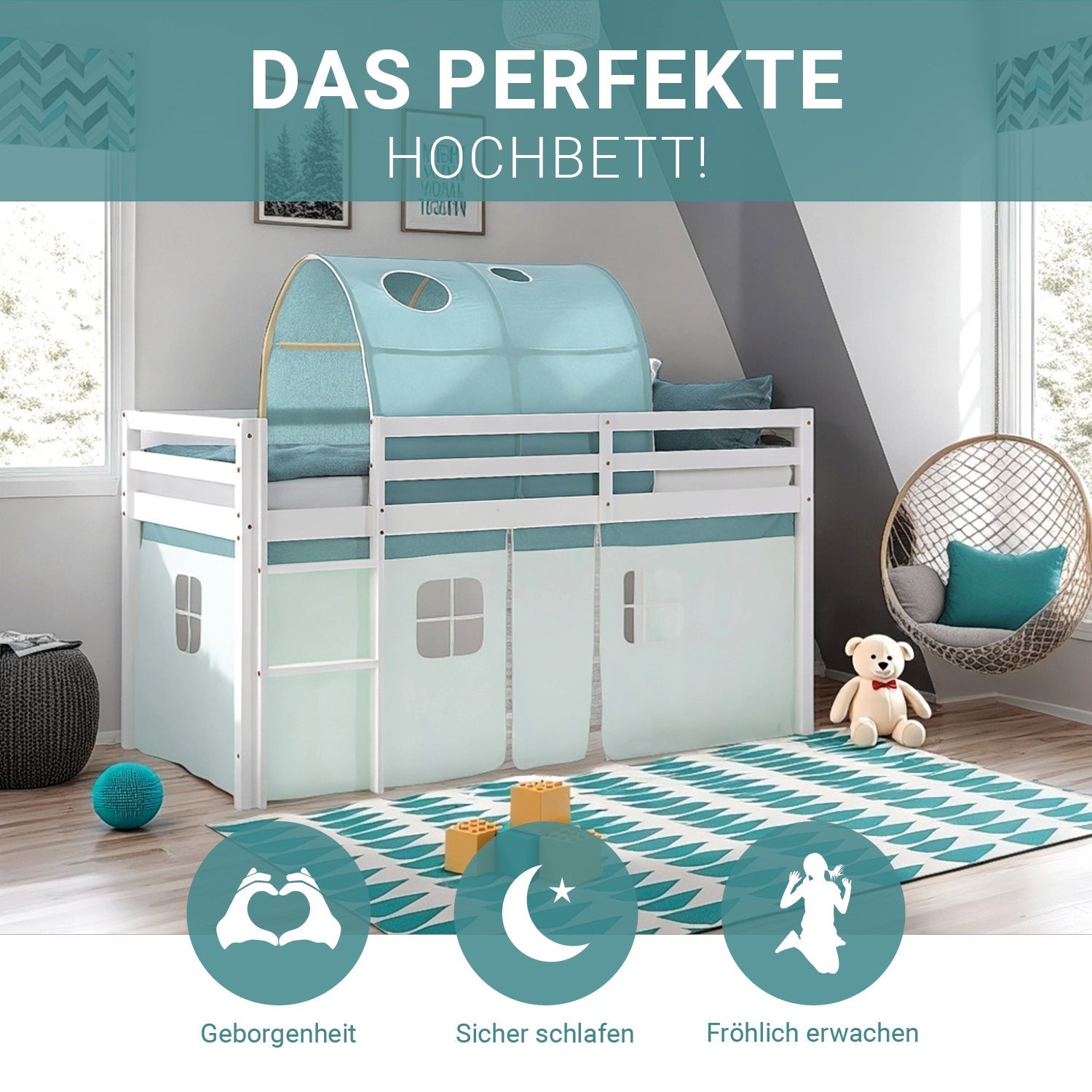 Dieses Hochbett aus massivem Holz verbindet durchdachtes Design mit Funktionalität und schafft eine stilvolle, platzsparende Lösung für das Kinderzimmer. Das robuste Bettgestell in zeitlosem Weiß fügt sich harmonisch in jede Einrichtung ein und bietet durch die wechselseitig montierbare Leiter maximale Flexibilität.