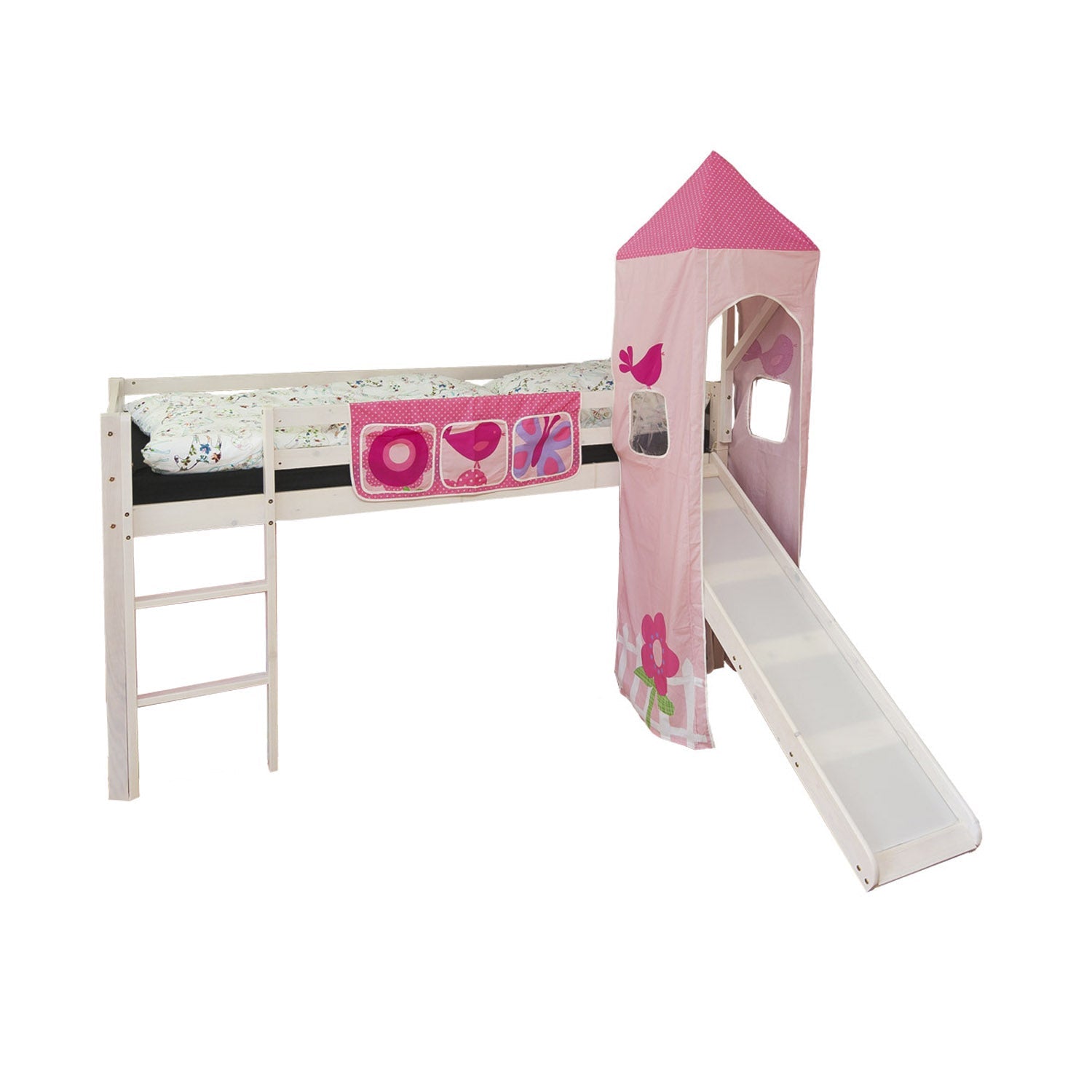 - Bettgestell mit Leiter, Rutsche, Turm, Stoff, Betttasche und Anleitung
