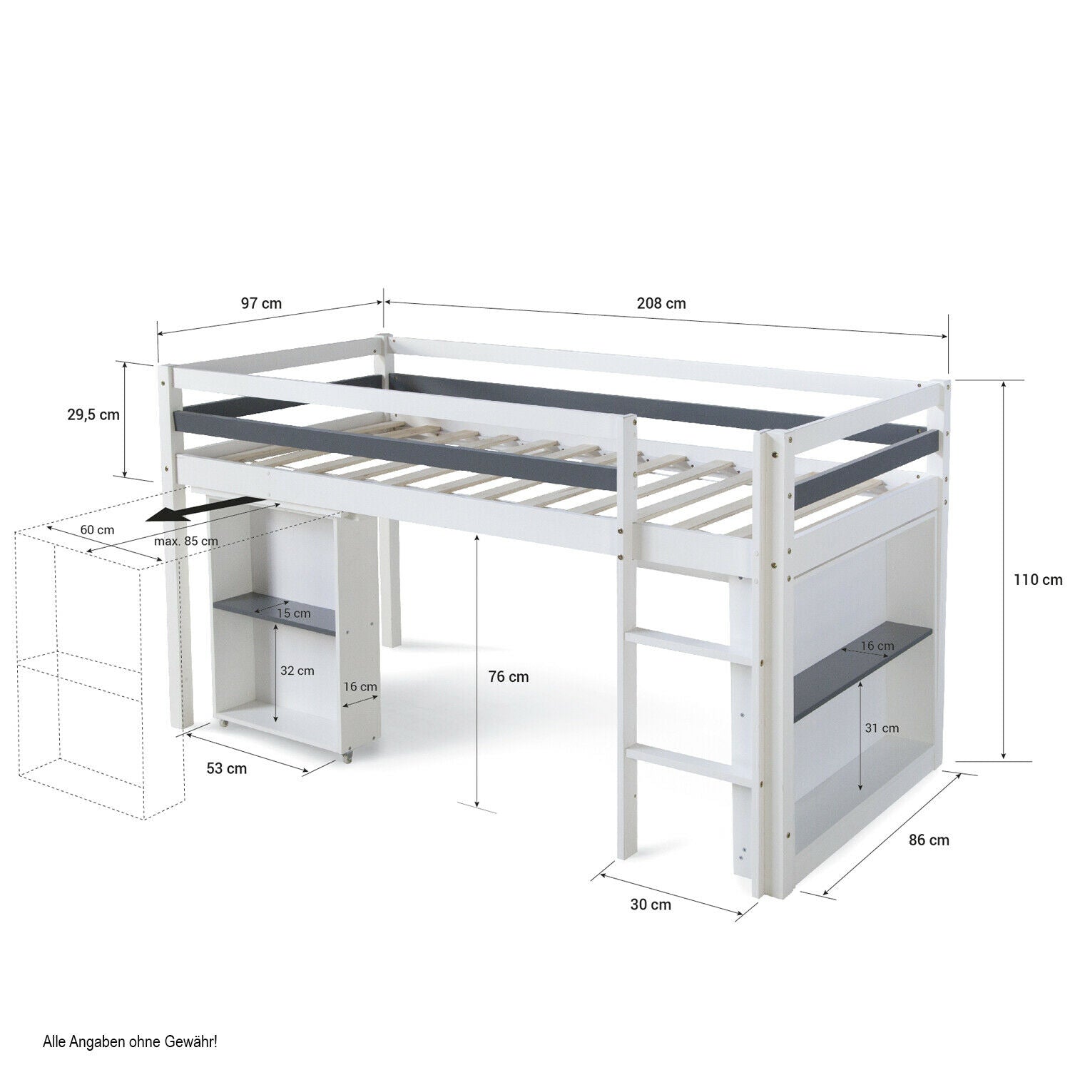 - Höhe unter dem Bett: Spielhöhe 76 cm
