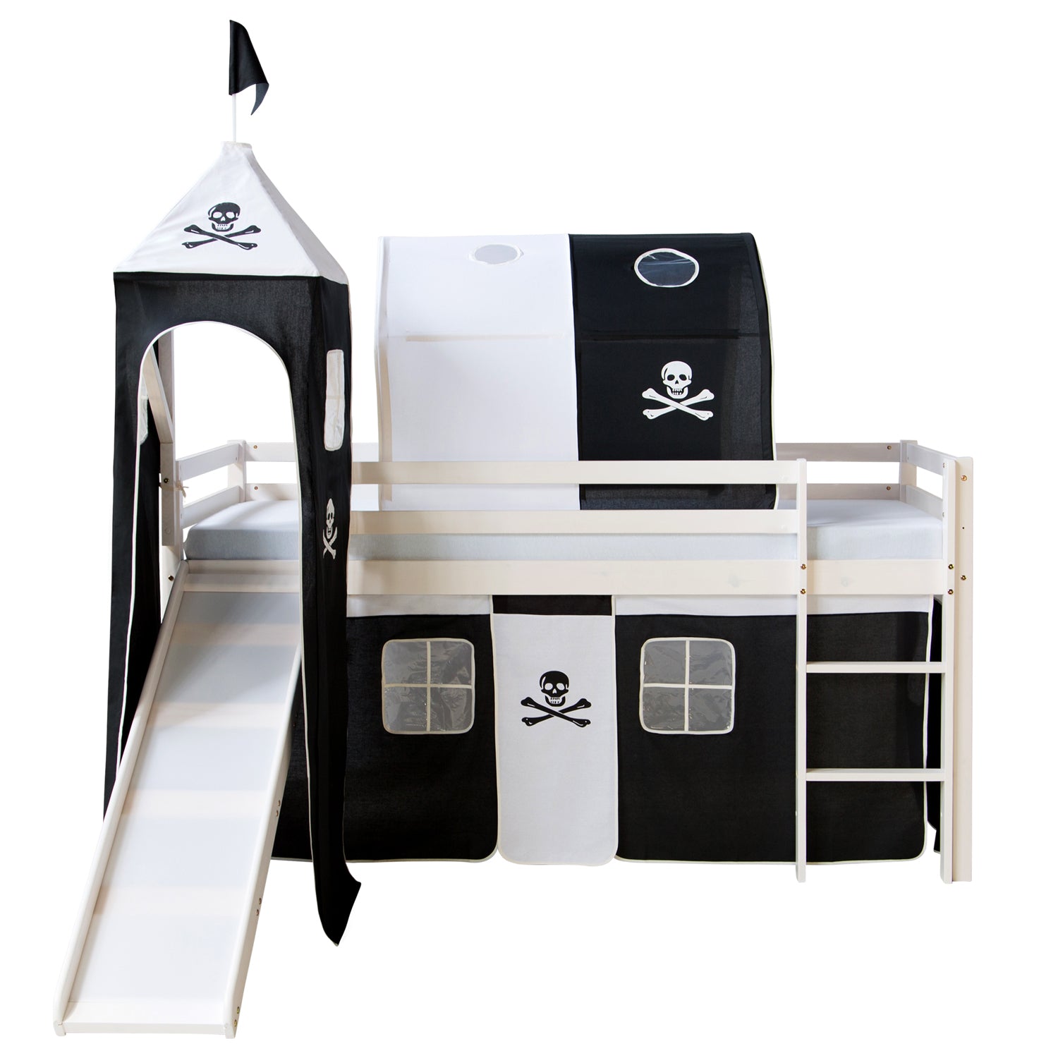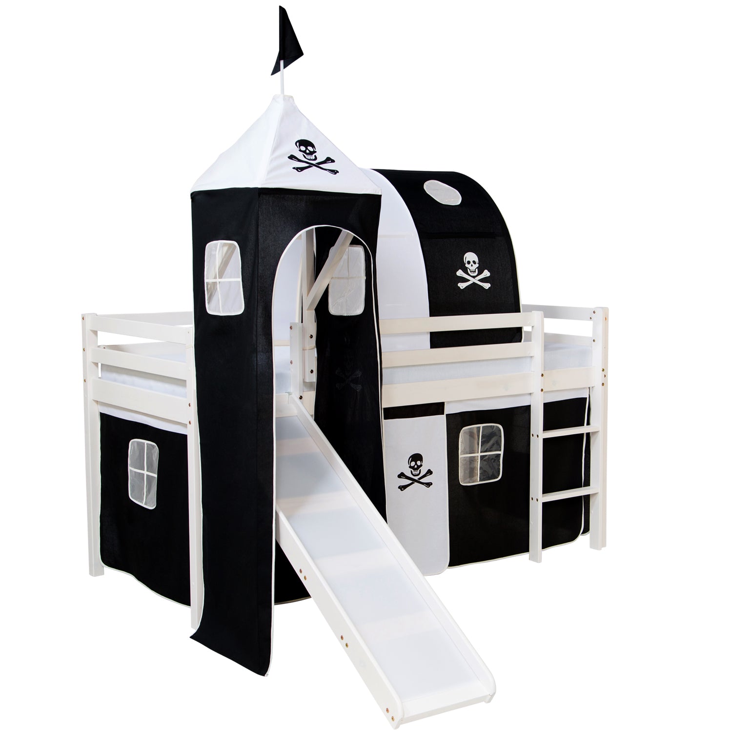 - Bettgestell mit Leiter, Rutsche, Turm, 1 x Vorhang, Tunnel