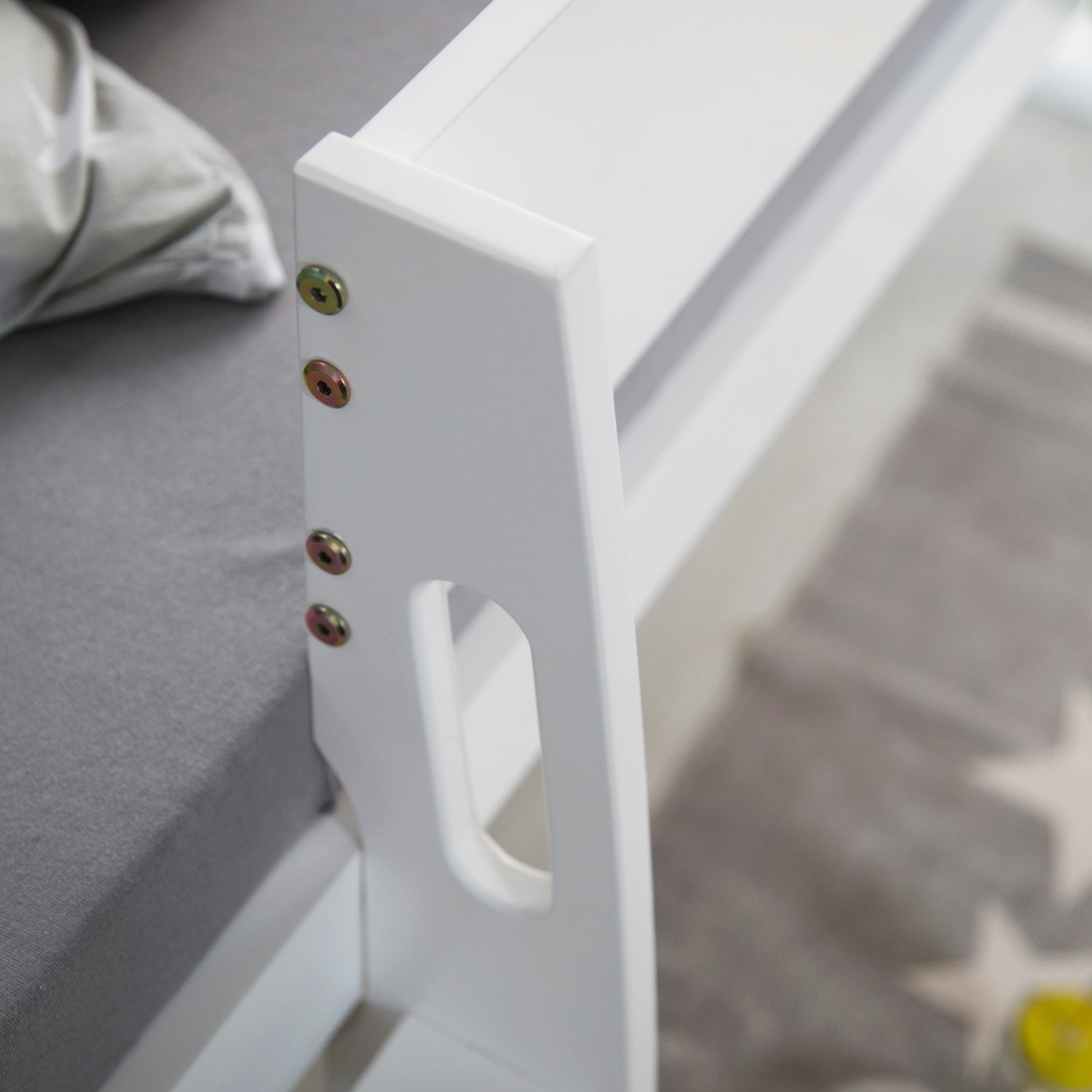 Unser Hochbett für Kinder- und Jugendzimmer: Schlafplatz, Höhle und genug Platz zum Toben! Das Bett überzeugt durch seine hochwertige, stabile Verarbeitung, modernem Design in Form und Farbe: Leiter, Leitergriffe und Seitenteile sind abgerundet, die grauen Seitenflächen setzen einen schönen Kontrast zum weißen Bettgestell. Die Leitertreppe ist flexibel rechts -und linksseitig montierbar. Die Leitergriffe bieten zusätzliche Sicherheit. Alle Pfosten und Kanten sind abgerundet, die Bettseiten leicht erhöht, damit ihr Kind nicht aus dem Bett fallen kann. Unter der erhöhten Liegefläche ist jede Menge Platz, der praktisch genutzt werden kann für eine Kuschelhöhle oder Stauraum mit kleinen Regalen, Krimskramskisten usw.