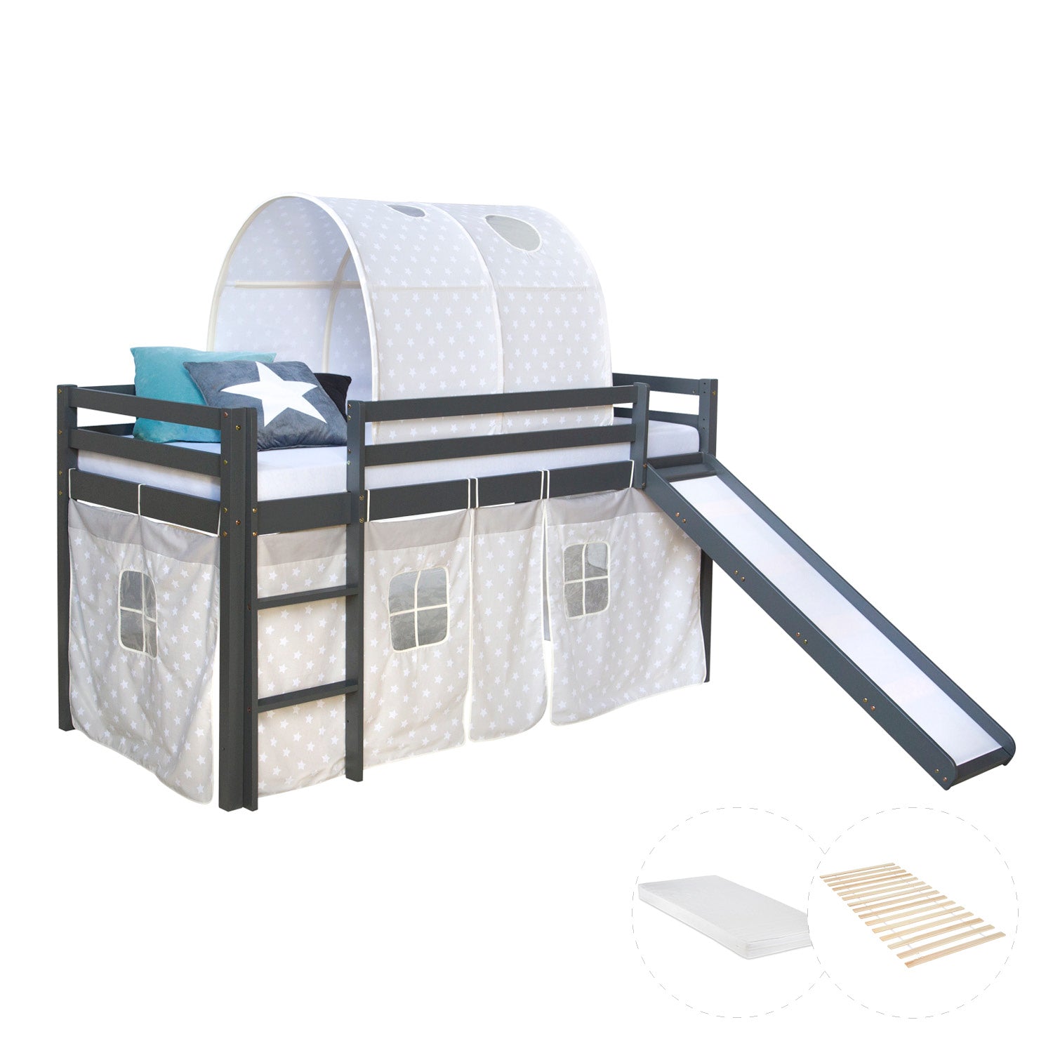 Entdecken Sie unser hochwertiges Hochbett 90x200 cm in Grau, das ideal für jedes Kinderzimmer ist! Dieses Kinderbett ist mehr als nur ein Schlafplatz – es verwandelt das Zimmer Ihres Kindes in einen Ort voller Spaß und Abenteuer. Die integrierte Rutsche macht das Aufstehen am Morgen zum Vergnügen und das Zubettgehen zum aufregenden Erlebnis. Gefertigt aus hochwertigem Massivholz, überzeugt das Stockbett durch seine Langlebigkeit und Stabilität. Ein Rolllattenrost und eine Matratze, welche den ruhigen und erholsamen Schlaf Ihres Kindes unterstützen, sind inklusive, sodass es nach einem anstrengenden Tag wieder Kraft für neue Abenteuer tanken kann.