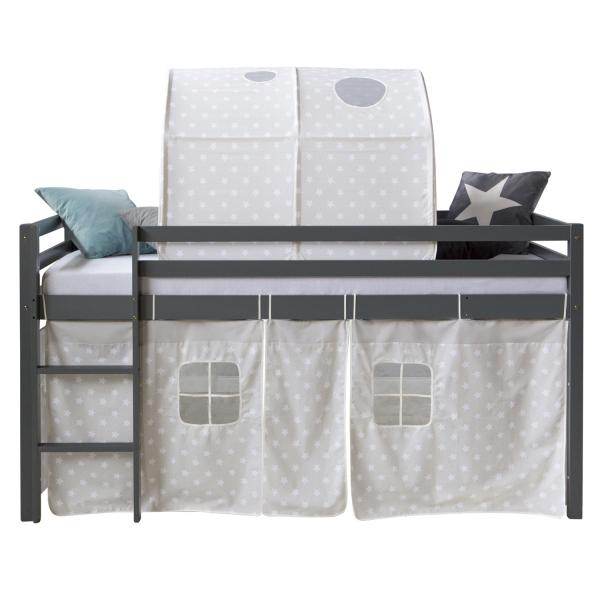 Sicherheitsmerkmale wie ein umlaufender Rausfallschutz und eine stabile Leiter, die je nach Raumgestaltung flexibel links oder rechts montiert werden kann, sorgen für sicheren Ein- und Ausstieg. Besonderes Highlight sind der mitgelieferte Vorhang und Tunnel mit verträumtem Sternenmuster, die den Bereich unter dem Bett in einen behaglichen Rückzugsort verwandeln. Die weißen Sterne zaubern eine himmlische Stimmung ins Kinderzimmer und regen die Vorstellungskraft an. Dieses Hochbett vereint Funktionalität und ansprechendes Design und schafft eine gemütliche Oase im Kinderzimmer.