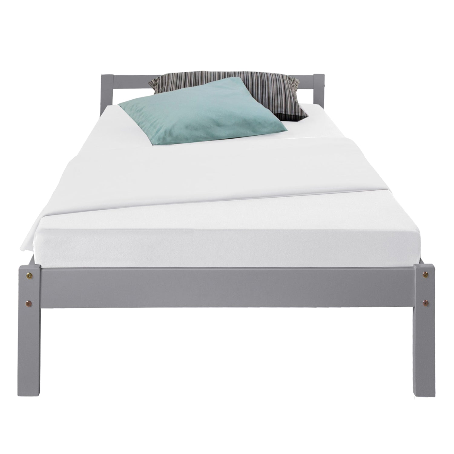 Passend zum Bettgestell, in dezentem Grau, gibt es ein Rolllattenrost kostenfrei dazu, jedoch kann auch ein eigenes Lattenrost verwendet werden. Die Matratze sowie Dekoration sind nicht im Lieferumfang enthalten.