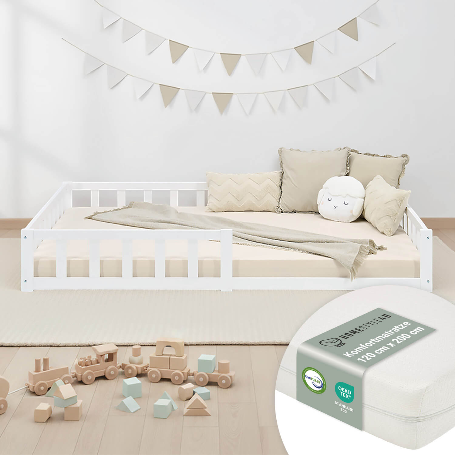 Kinderbett / Bodenbett aus massivem Kiefernholz 120x200 cm – weiß, inkl. Matratze