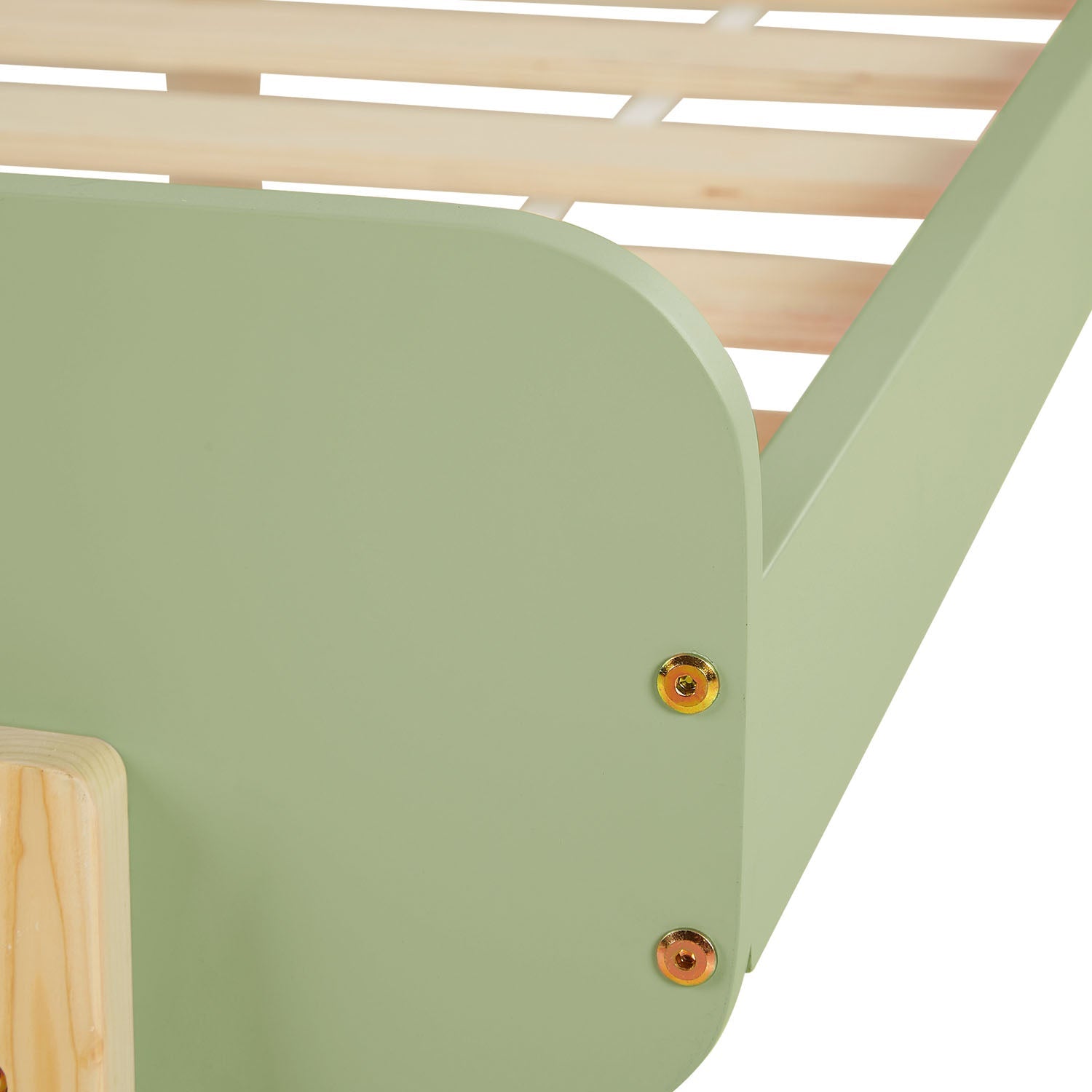 - grüner Bettrahmen und naturfarbene Füße aus massivem Kiefernholz