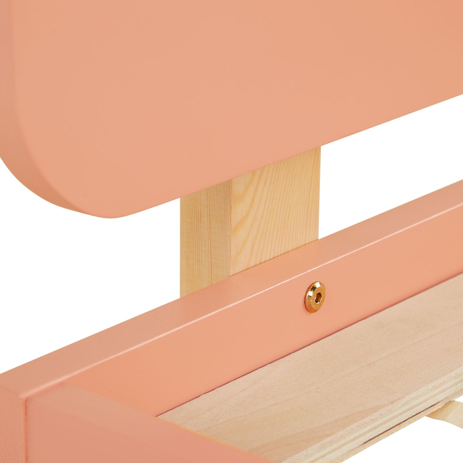 - beigeroter Bettrahmen und naturfarbene Füße aus massivem Kiefernholz