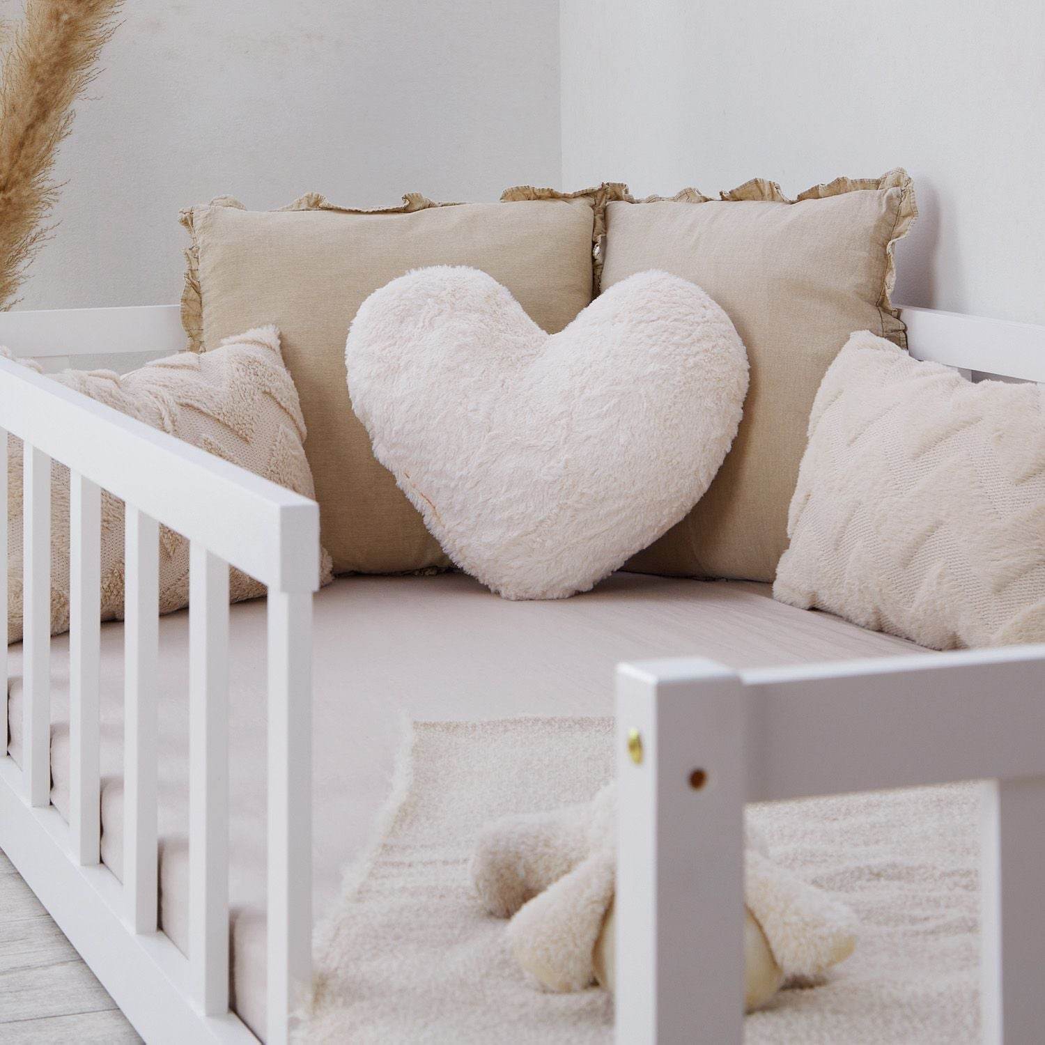 Die niedrige Liegehöhe lädt kleine Abenteurer dazu ein, selbstständig ins Bett zu klettern, während der umlaufende Rausfallschutz für sicheren Schlaf sorgt, egal wie wild die Träume werden. Und wenn der Tag beginnt? Mit ein paar Kissen wird das Kinderbett im Handumdrehen zur gemütlichen zur Kuschelecke für ruhige Momente.