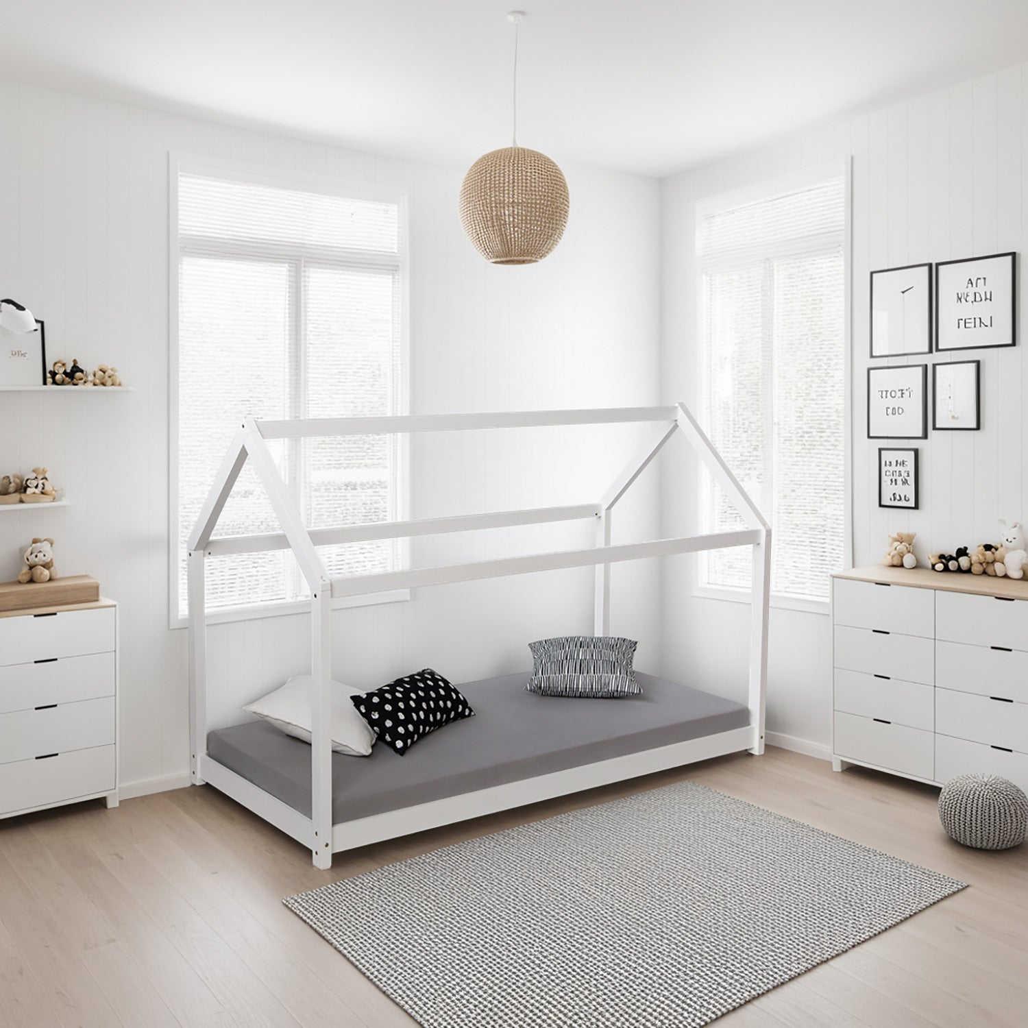 Dieses moderne Hausbett in zeitlosem Weiß überzeugt durch minimalistisches Design und hohe Funktionalität. Gefertigt aus robustem Holz, bietet es eine langlebige und stabile Schlaflösung für Kinder oder Jugendliche. Die markante Hausform des Gestells sorgt für eine harmonische Optik, die sich in jedes Kinder- oder Jugendzimmer einfügt. Die bodennahe Konstruktion gewährleistet einen sicheren Zugang und macht das Bett besonders geeignet für jüngere Kinder.