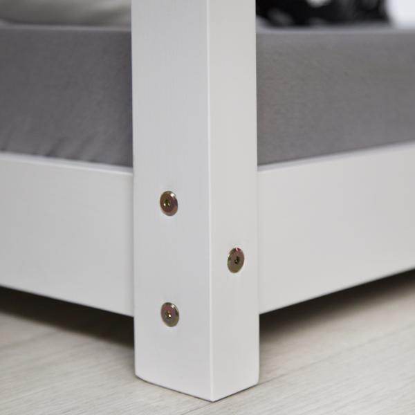 Ein einfaches Kinderbett mit Lattenrost mit großer Wirkung. Aus massiven Holzlatten und Pfosten in Form eines Hauses wird das Bett zu einer Spielhöhle, Kuschel- und Schlafplatz. Durch die stabile und sichere Konstruktion, Bodenhöhe der Liegefläche sowie die pflegeleichte und hochwertige Oberfläche des Holzes ist das Hausbett besonders kinderfreundlich. Das Kinderhausbett wird mit detaillierter Aufbauanleitung geliefert und ist leicht zu montieren. Matratze, Bettwäsche und Kissen sind nicht im Lieferumfang enthalten.