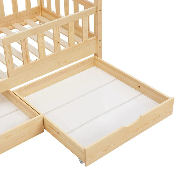 Wohin mit dem ganzen Spielzeug? Nutzen Sie dafür die 2 geräumigen Schubladen unter dem Kinderhausbett. Die jeweils 78x84x14 cm große Schublade bietet viel Platz für mehr Ordnung im Kinderzimmer. Durch die Rollen lassen sich die Bettkästen leicht ein- und ausfahren.