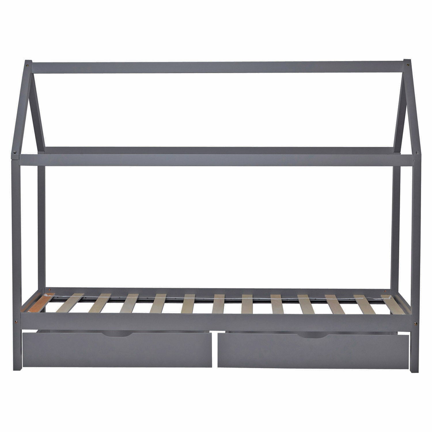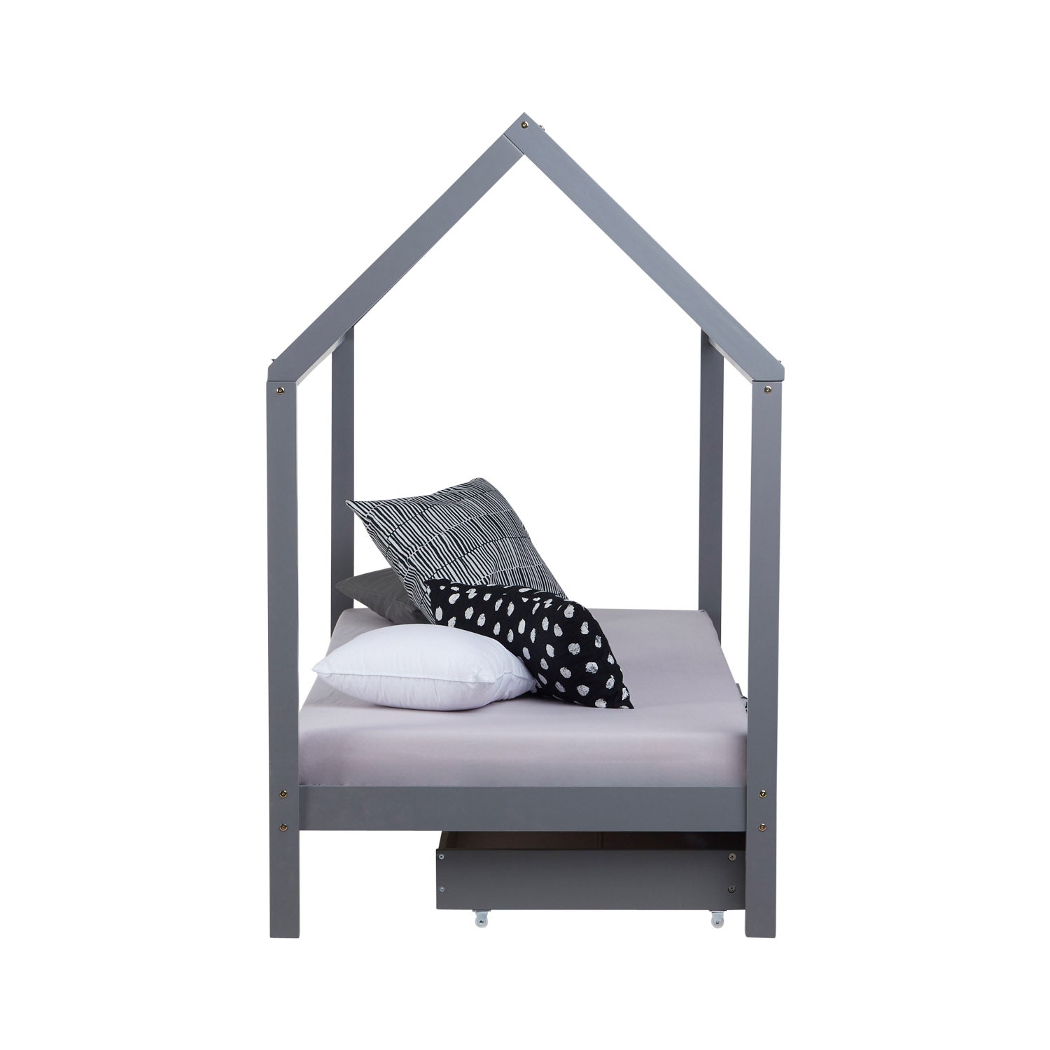 Ein einfaches Kinderbett mit großer Wirkung, welches viel Stauraum und Aufbewahrungsmöglichkeiten durch 2 Bettkästen bietet, wird zum neuen Highlight Ihres Kinderzimmers. Aus massiven Holzlatten und Pfosten in Form eines Hauses wird das Bett tagsüber zu einer Spielhöhle für spannende Abenteuer, während es am Abend Ihrem Nachwuchs, als Kuschel- und Schlafplatz, erholsame Nächte verschaffen wird. Die stabile und sicher Konstruktion in dezentem Grau wird aus massivem Kiefernholz gefertigt und lässt sich gut in alle Arten von Kinder- und Jugendzimmern integrieren. Besonders kinderfreundlich wird das Spielbett durch die pflegeleichte und hochwertige Oberfläche des Holzes. Die 2 geräumige Bettschubladen schaffen vielseitig nutzbaren Platz zur Aufbewahrung, beispielsweise für Kissen und Decken. Das Hausbett wird mit detaillierter Aufbauanleitung geliefert und ist leicht und schnell zu montieren. Matratze, Bettwäsche und Kissen sind nicht im Lieferumfang enthalten.