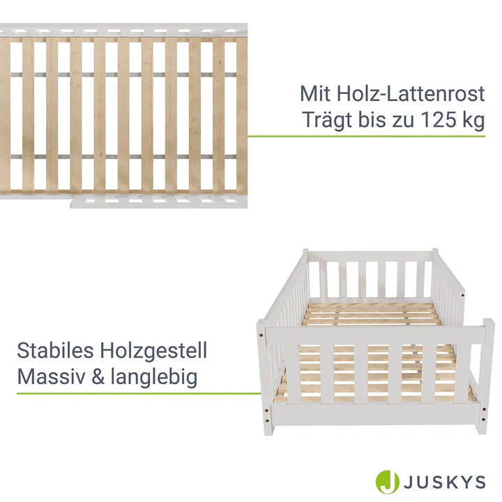 Der Lattenrost verfügt über Sprossen aus Holz und kann bis zu 125 kg tragen. So kann sich Mama oder Papa zur Gute-Nacht-Geschichte einfach mit ins Bett kuscheln.
