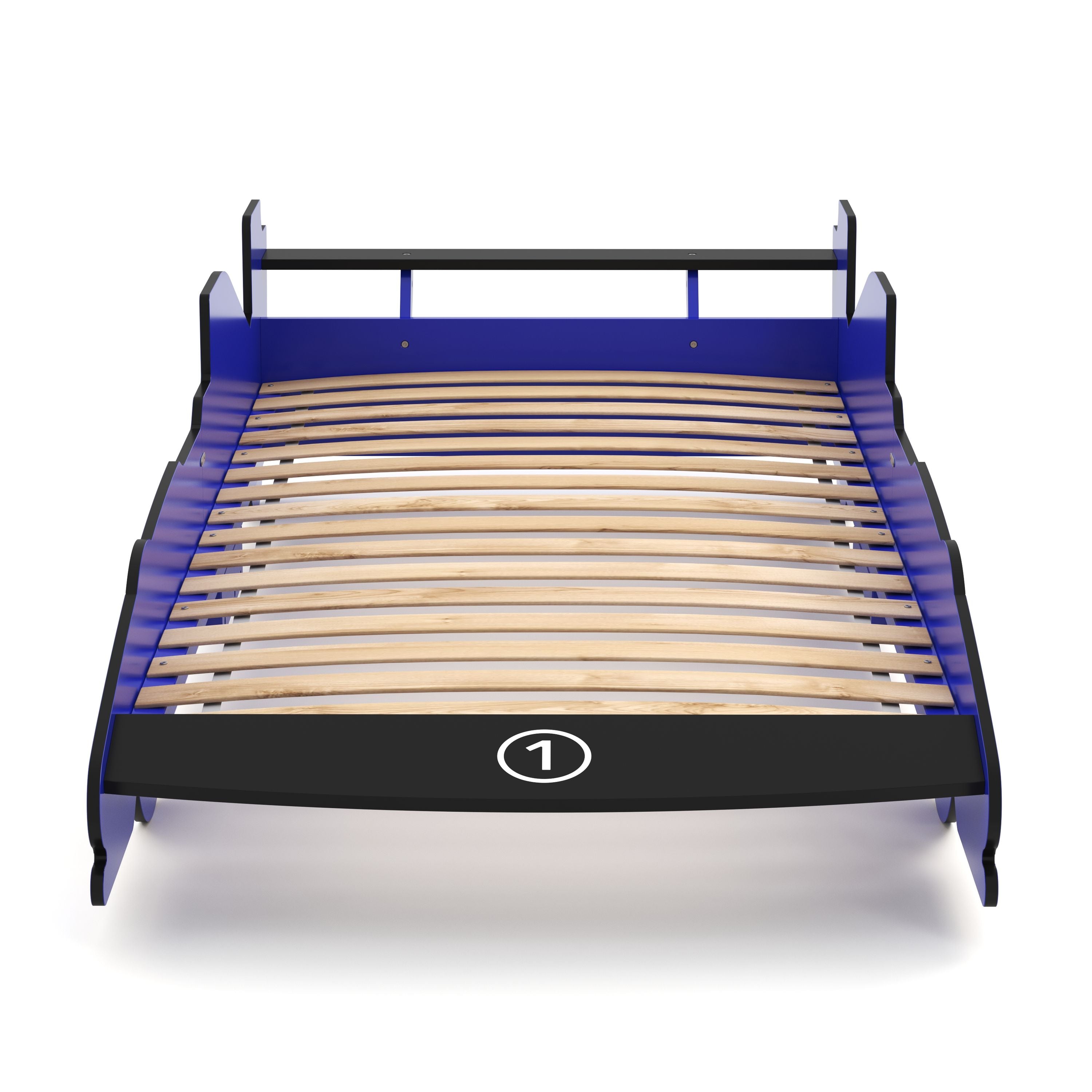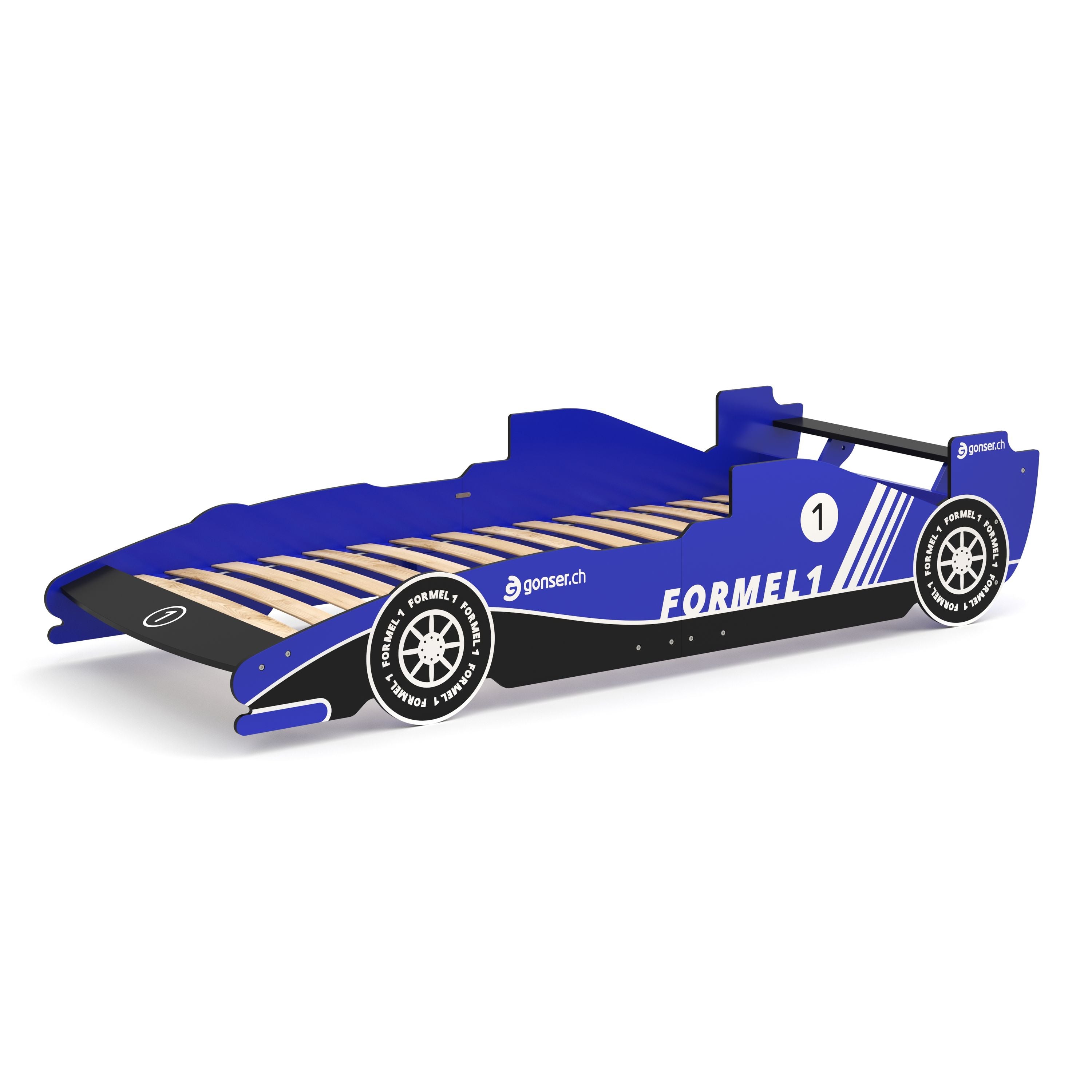 Dieses Kinderbett im Rennauto-Look begeistert nicht nur kleine Autofans! Durch die blauen Seitenverkleidungen mit aufgemalten Rädern erhält das Bett die Silhouette eines schnittigen Rennwagens. Auf dem schwarzen Heckflügel können Kuscheltiere und andere Kleinigkeiten hingestellt werden. Dank des bequemen Holz-Lattenrostes wird dein Kind wunderbar träumen und schlafen! Sorge mit diesem ausserordentlichen Bett für einen besonderen Hingucker im Kinderzimmer!