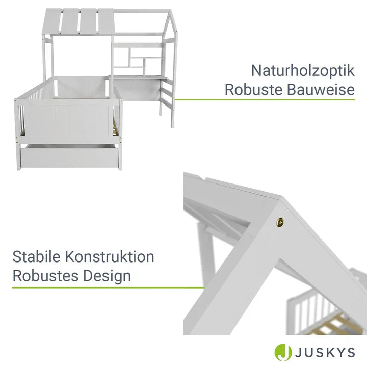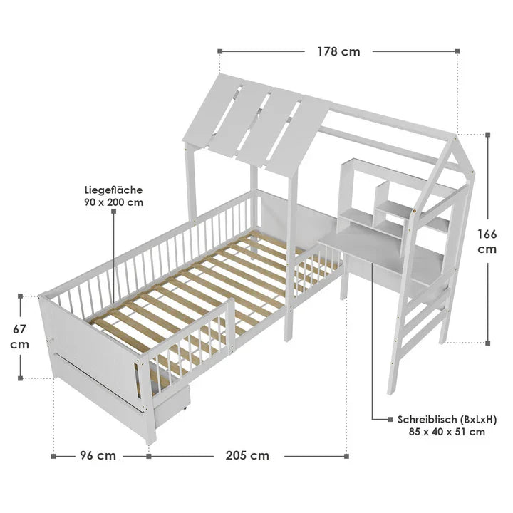 Das liebevoll gestaltete Spielbett mit Dachaufbau, integriertem Schreibtisch und Regal schafft eine kreative Wohlfühlwelt zum Schlafen, Spielen und Lernen.